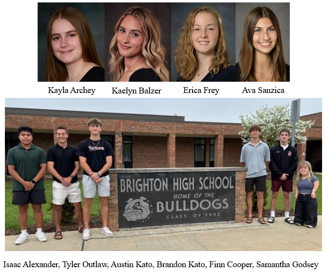 Kayla Archey was awarded the Class of 1963 Scholarship. Erica Frey was awarded the Class of 1965 Scholarship. Ava Sanzica was awarded the Class of 1971 Scholarship. Tyler Outlaw was awarded the Class of 1975 Scholarship. Finn Cooper and Samantha Godsey were awarded the Go-Liv-Co Horal Family Foundation Scholarships. Isaac Alexander was awarded the Myra Shosey Memorial Scholarship. Austin Kato and Brandon Kato were awarded Brighton Area Schools Alumni Association Scholarships. Each were awarded $1000.00